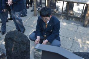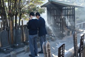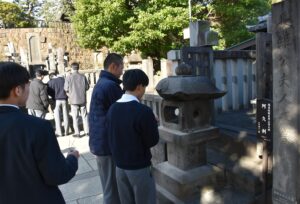 生徒たちは、主君の敵を取るために純潔の生涯を捧げた四十七士の墓前にお線香をあげ、両手を合わせました。