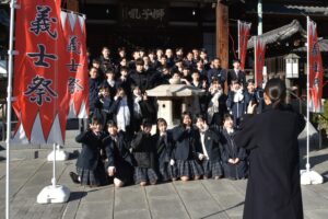 本校の校歌(2番)には「ありし昔を今偲ぶ/赤穂の浪士眠るとこ」という一節があります。「忠臣蔵」で有名な赤穂義士のお墓がある泉岳寺が学校の真裏にあるということで、1年生全員が泉岳寺と大石内蔵助が切腹を遂げた地を訪れました。