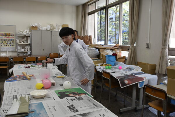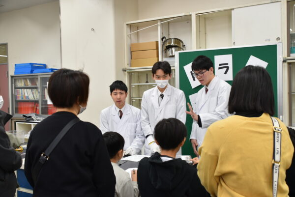 本校SSHクラスの生徒有志による「SSH委員会」が、地域の小学生を対象に理科の楽しさを披露する科学教室です。会場にはスライムやドライアイス、液体窒素などをテーマにした10種類の実験ブースが設置され、身近な科学から不思議な現象まで、体験を通してSSH委員会の生徒たちが子どもたちにわかりやすく解説しました。