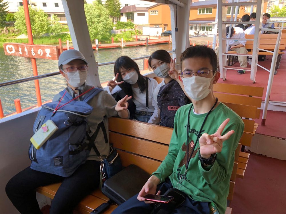宿泊先を出発後、羅臼国後展望塔へ。海抜167mの高台から羅臼港や根室海峡、国後島を眼下に眺めました。この知床では、多くの自然体験を満喫することができました。生徒たちを乗せたバスは知床を離れ標津へ移動し、サーモン科学館を訪問。サケ稚魚の放流、北海道の様々なサケ科魚類の展示見学、チョウザメに指を噛ませる体験(この魚には歯がないので痛くありません)等、様々な体験をしました。午後からは海岸沿いから内陸部にバスを走らせ、広大な牧草地が広がる平原を抜けて阿寒湖に到着。遊覧船で阿寒湖を周遊し、阿寒湖内に浮かぶチュウルイ島では特別天然記念物のマリモの水槽展示を見学しました。